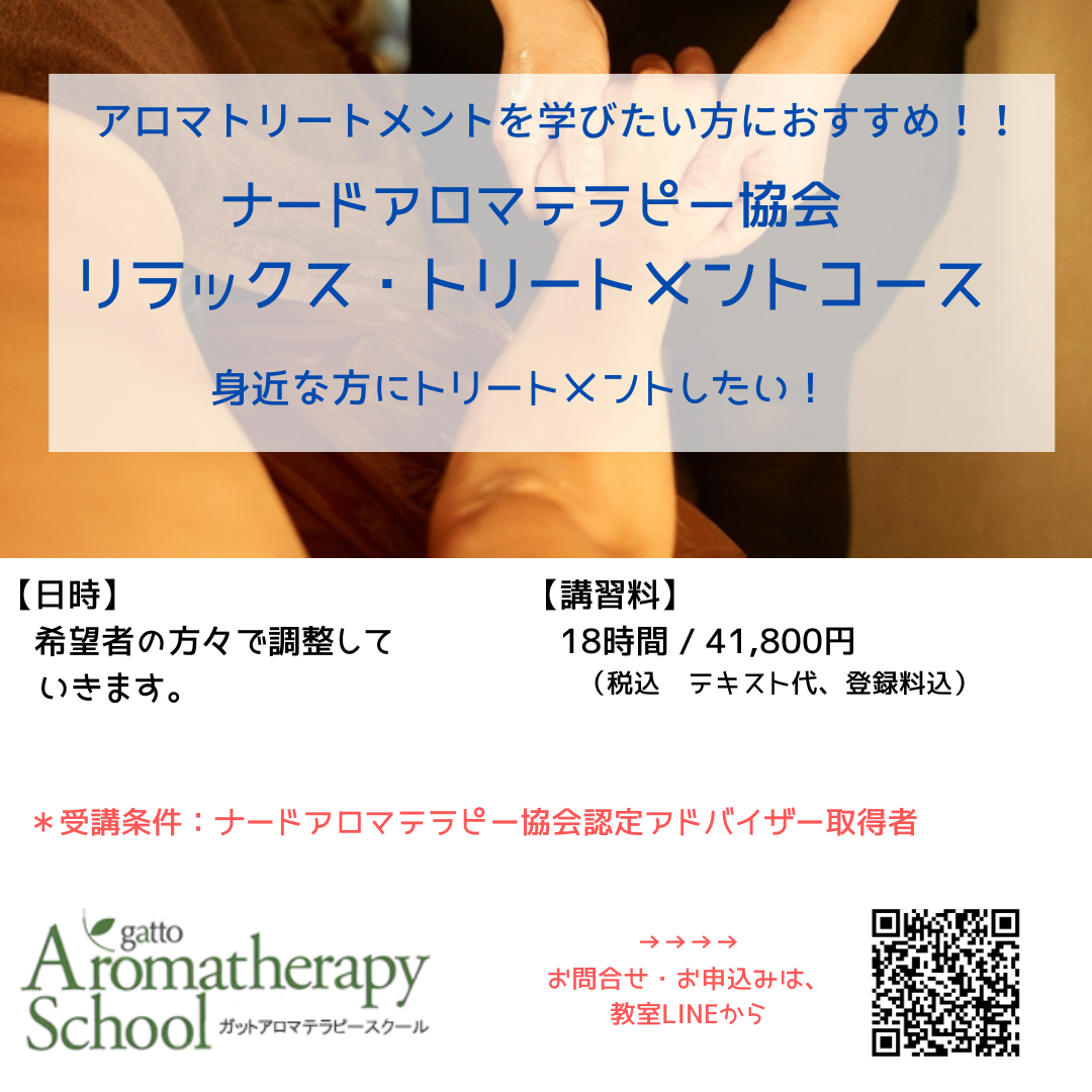 ナード・アロマテラピー協会認定「リラックス・トリートメントコース」をリクエスト開催しております。